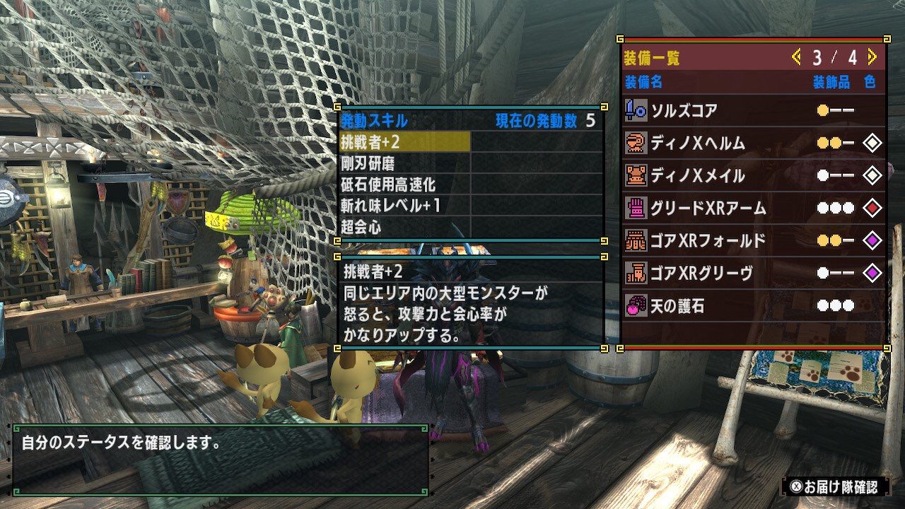 会心強化5s3があれば武器スロ無しで挑戦者2斬れ味1剛刃研磨超会心+5スロスキルが実現するのに畜生!!ちなみに会心強化4s3でも武器スロ1あれば可能